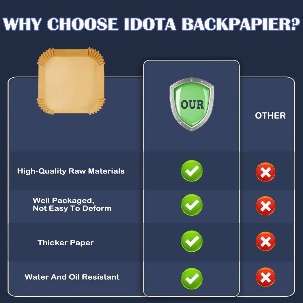 【Gesundes Und Zuverlässiges Material】 – Unsere Backpapier Heißluftfritteuse sind aus hochwertigem Pergamentpapier in Lebensmittelqualität hergestellt, das wasserdicht, ölbeständig, antihaftbeschichtet und 100 % gesund ist. Mit schöner Hitzebeständigkeit, hält Temperaturen bis zu 428 Grad Fahrenheit stand. Hält jede Art von Speisen in ihrem perfekten Aussehen und ohne den Geschmack der Speisen zu beeinträchtigen.
